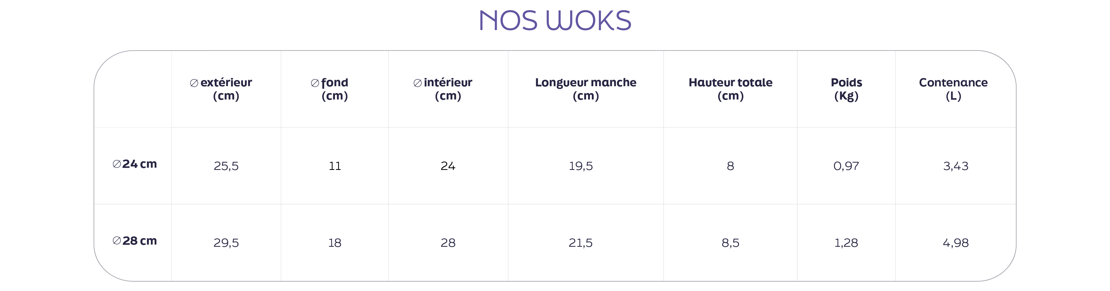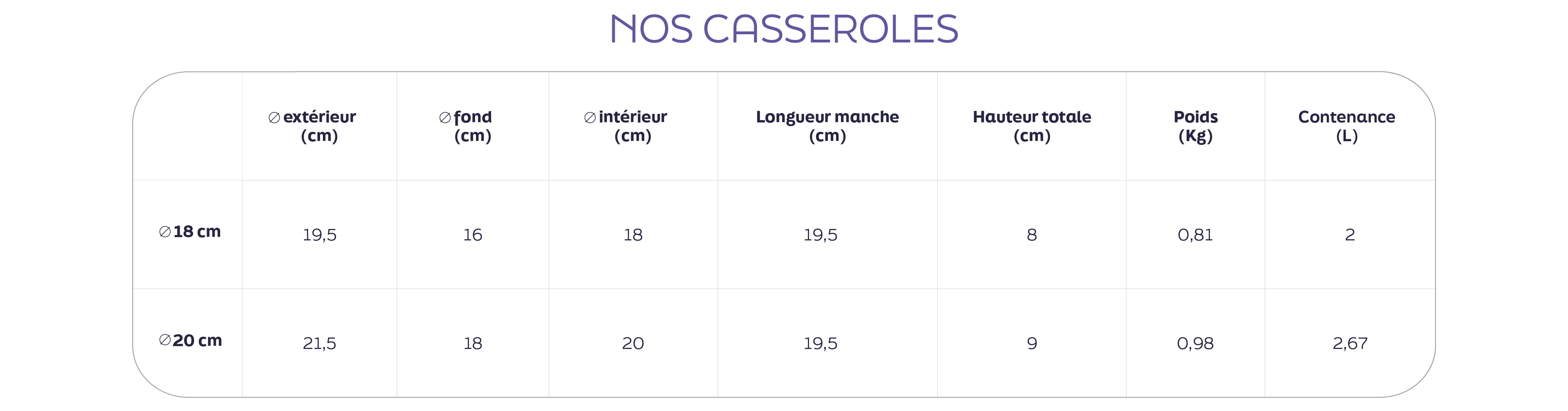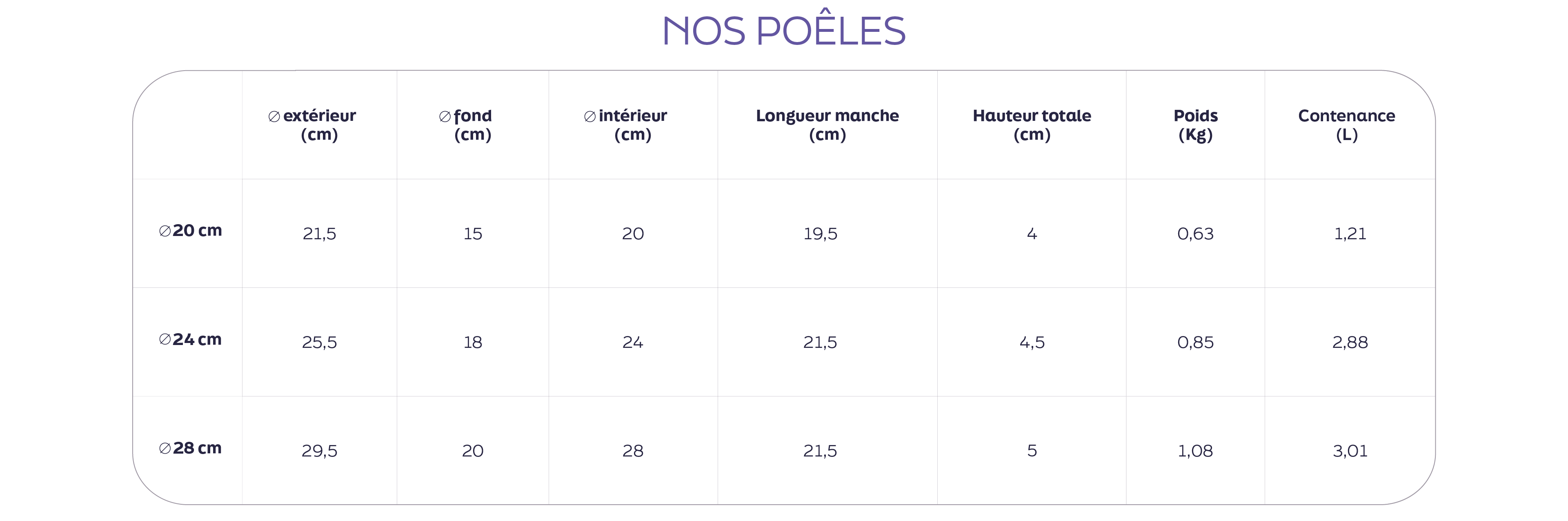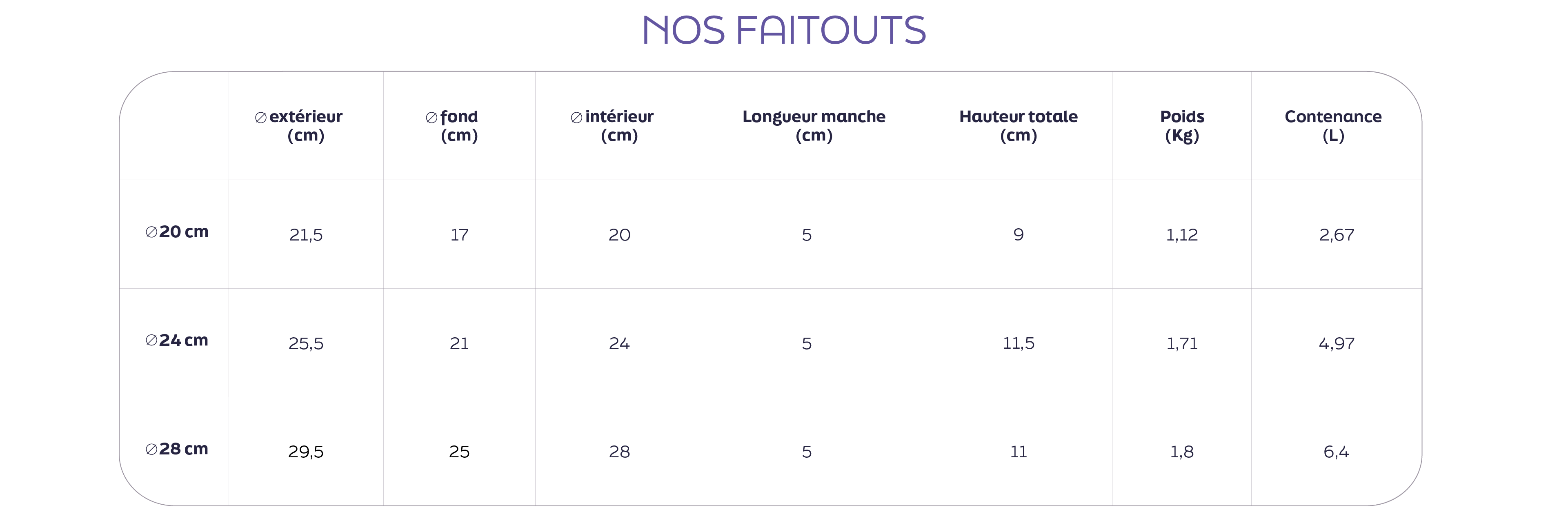 Les dimensions de nos ustensiles